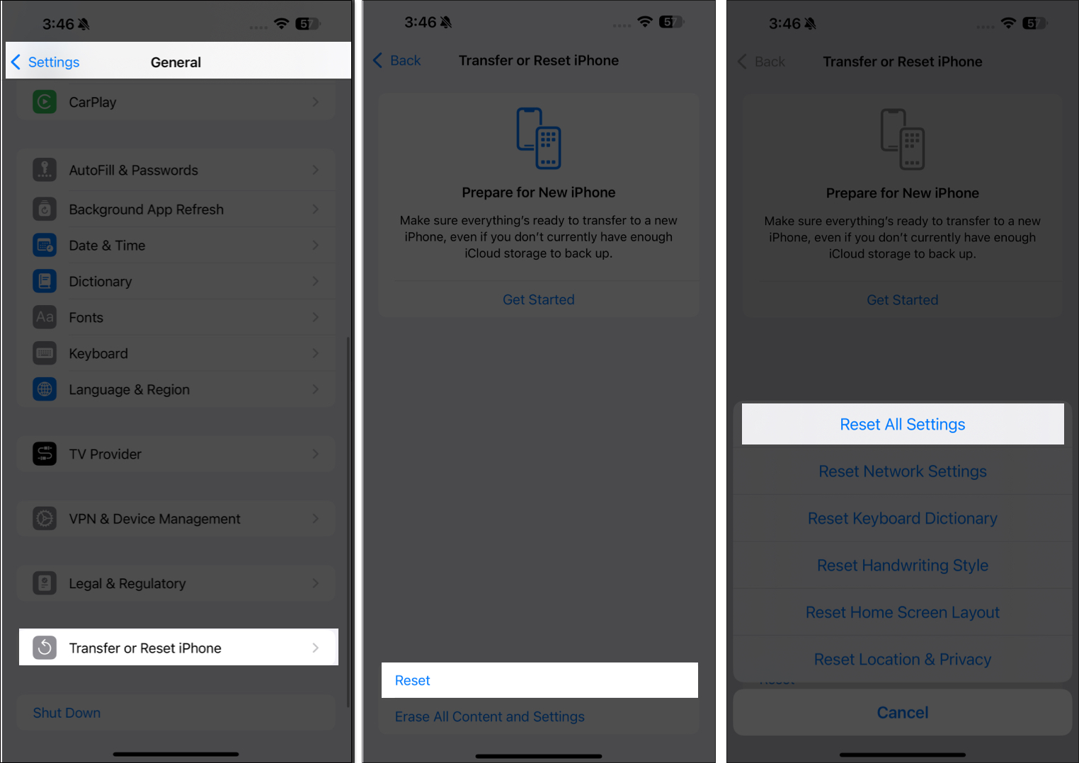 Ir aAjustes→General, desplácese hacia abajo y toqueTransferir o restablecer iPhone. Aquí, seleccioneReiniciary luegoRestablecer todas las configuraciones. Ingresa tu contraseña, si se te solicita, luego tocaRestablecer todas las configuracionespara confirmar.