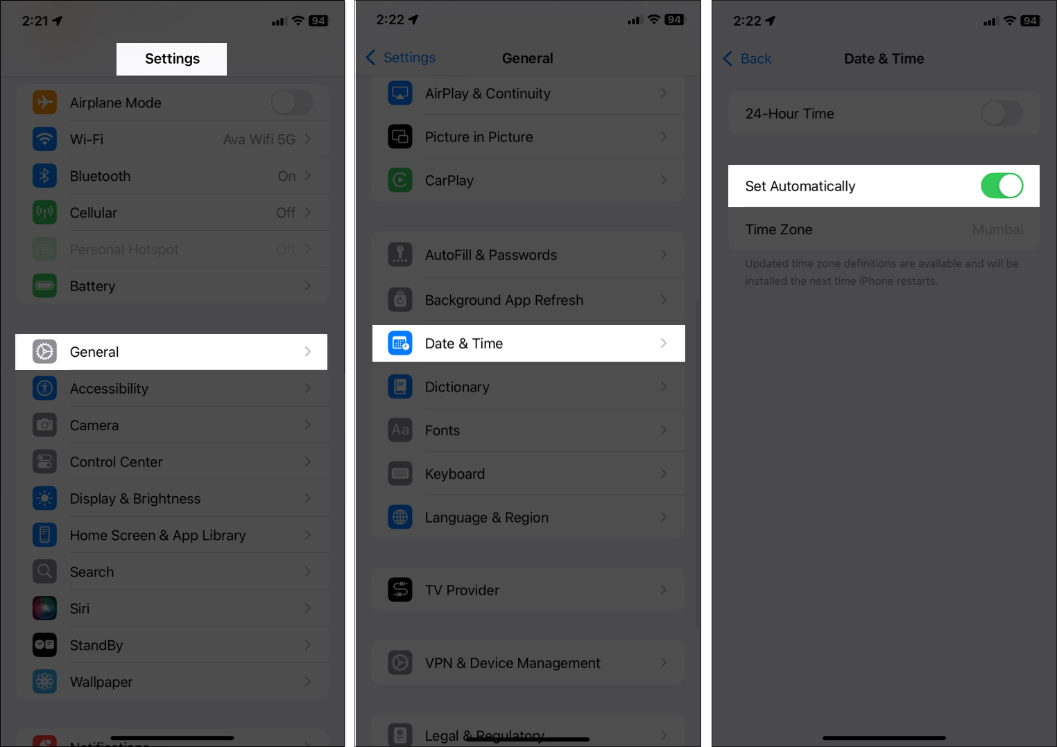 Para verificar la configuración de fecha y hora, vaya aAjustes, seleccionarGeneraly tocaFecha y hora. Aquí, activaEstablecer automáticamentey garantizar la correctaHuso horariose muestra. Si no, apágalo, tocaHuso horarioy seleccione la ubicación correcta.