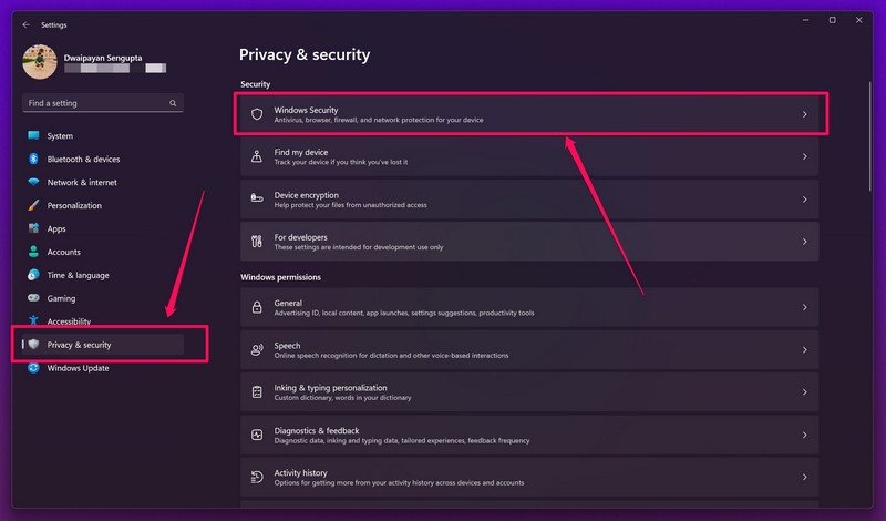 2.Ir alPestaña Privacidad y seguridaden la barra de navegación izquierda y haga clic enOpción de seguridad de Windowsen el panel derecho.