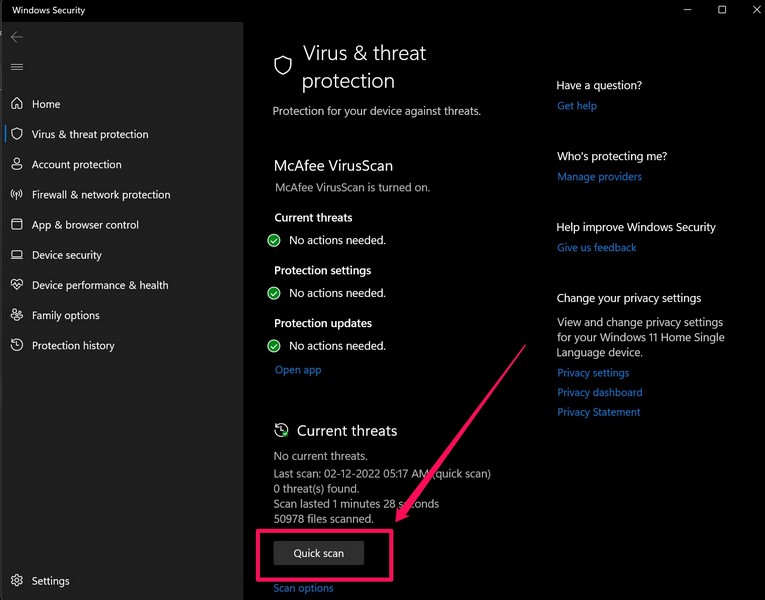 Además de los problemas y errores del sistema dentro de una carpeta, los posibles actores de amenazas, como virus o archivos de malware almacenados dentro de la carpeta, también pueden generar el error 0x80070091 "El directorio no está vacío" en Windows 11. Por lo tanto, si sigue recibiendo dicho error para una carpeta en su PC o computadora portátil, es posible que desee escanearla con un programa antivirus de terceros o la herramienta de seguridad de Windows.