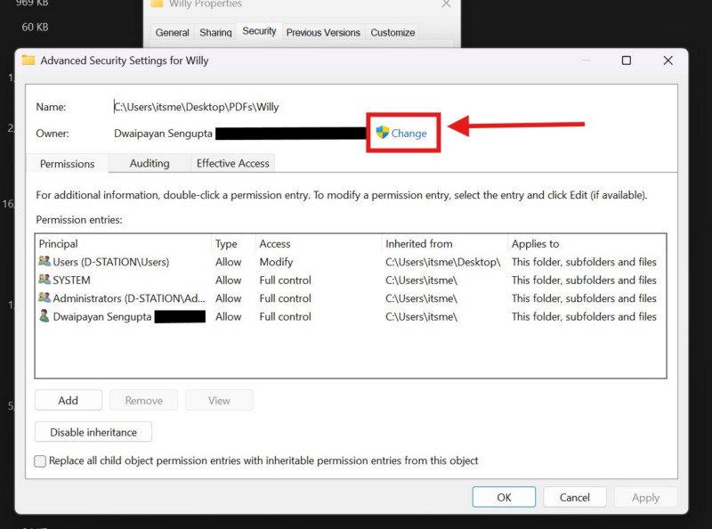 4.Dentro de la ventana Configuración de seguridad avanzada, haga clic en elBotón cambiaral lado del nombre del propietario.