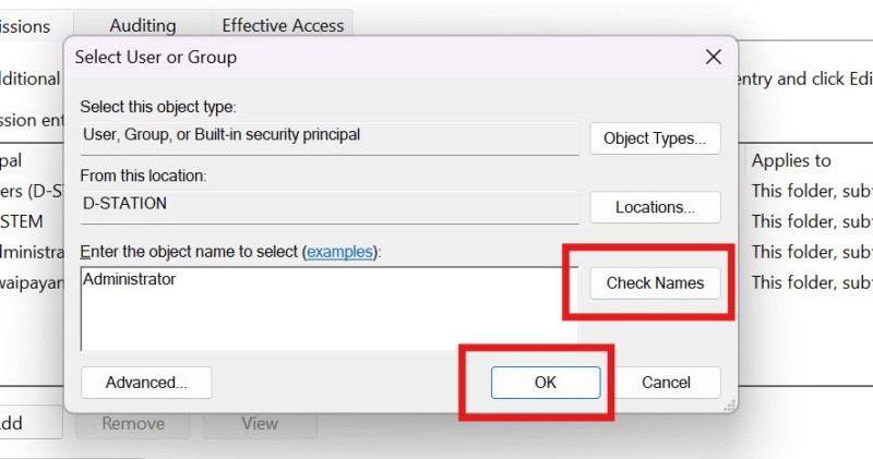 5.Ahora,escriba el nivel de su cuenta de usuario de Windowsdentro del campo de texto para la opción Ingrese el nombre del objeto para seleccionar. Puedes escribirAdministradoroInvitado.