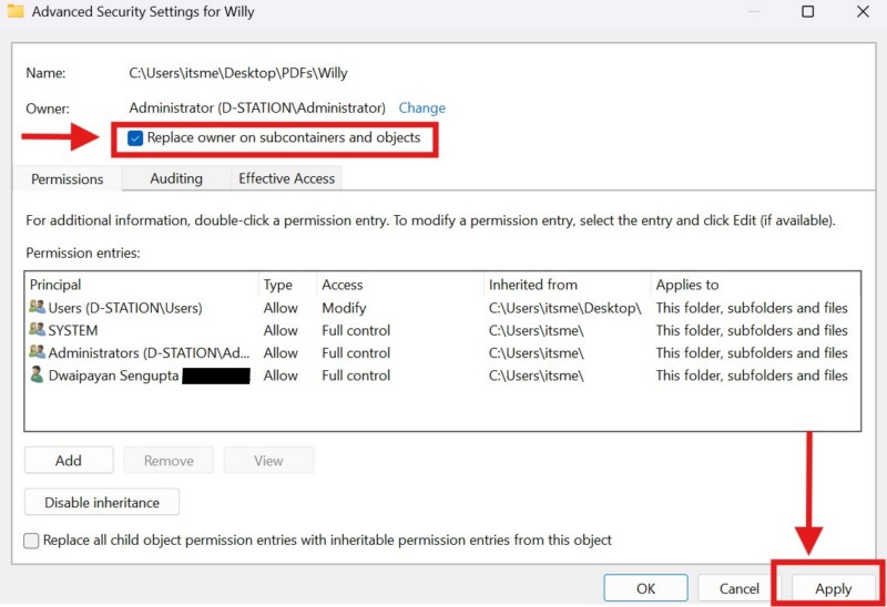 7.Próximo,haga clic en la casilla de verificaciónpara elOpción Reemplazar propietario en subcontenedores y objetospara habilitarlo y haga clic en elBotón Aplicarpara guardar el cambio.