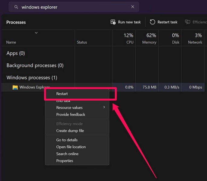 Ahora, una de las primeras cosas que puede hacer cuando encuentre el error 0x80070091 “El directorio no está vacío” en su PC o computadora portátil con Windows 11 es reiniciar el proceso del Explorador de Windows. Este método puede ayudar a deshacerse de cualquier problema temporal dentro del proceso del Explorador de Windows que pueda impedirle eliminar, cambiar el nombre o mover una carpeta y generar dicho error en su dispositivo. Y lo bueno es que es bastante fácil de ejecutar.