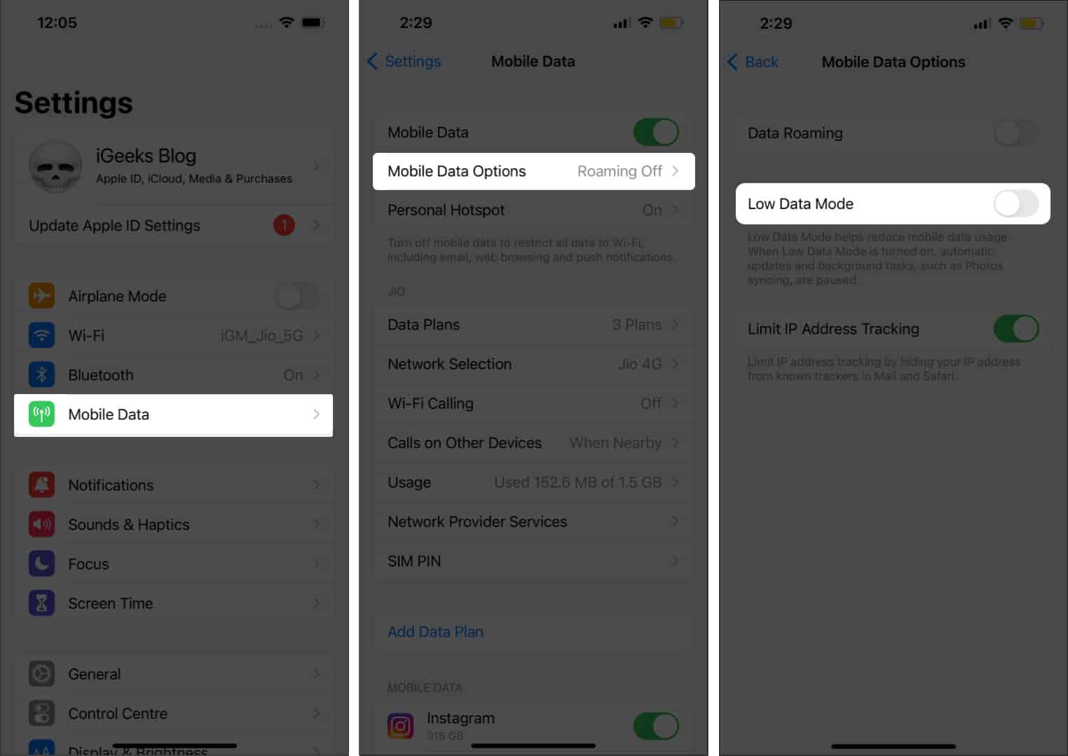 El modo de datos bajos impide que su iPhone acceda a Internet a toda velocidad cuando está conectado a datos móviles. Esto puede afectar las descargas de imágenes y la sincronización de archivos hacia y desde Fotos de iCloud. Por lo tanto, es mejor desactivar esta opción para estar seguro de que no está causando el problema en su dispositivo.