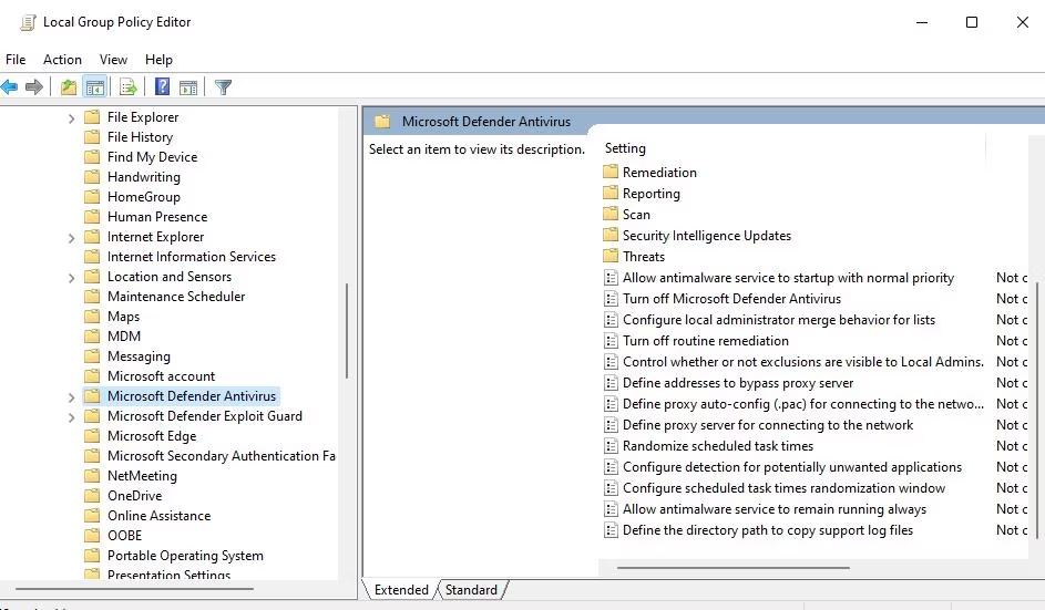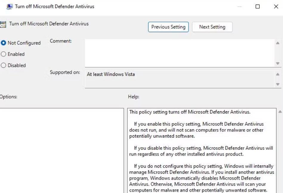 Algunos usuarios de Windows Pro y Enterprise han informado que desactivar la política antivirus de Microsoft Defender resolvió el problema "Página no disponible". ElDesactivar la política de grupo de antivirus de Microsoft DefenderLa configuración en Windows Pro y Enterprise se puede desactivar de la siguiente manera: