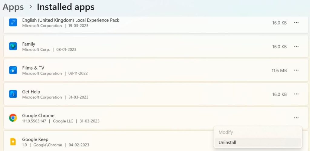 Paso 3:una lista deAplicaciones instaladasse abrirá en tu pantalla. Haga clic en los tres puntos junto al nombre de la aplicación que desea desinstalar y luego elijaDesinstalar.