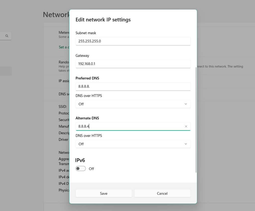 8.En elEditar la configuración de IP de la redmensaje, pegue su dirección IP en eldirección IPcampo de texto. Además, reemplace los dos últimos dígitos de la dirección IP pegada con cualquier número entre 5 y 30.