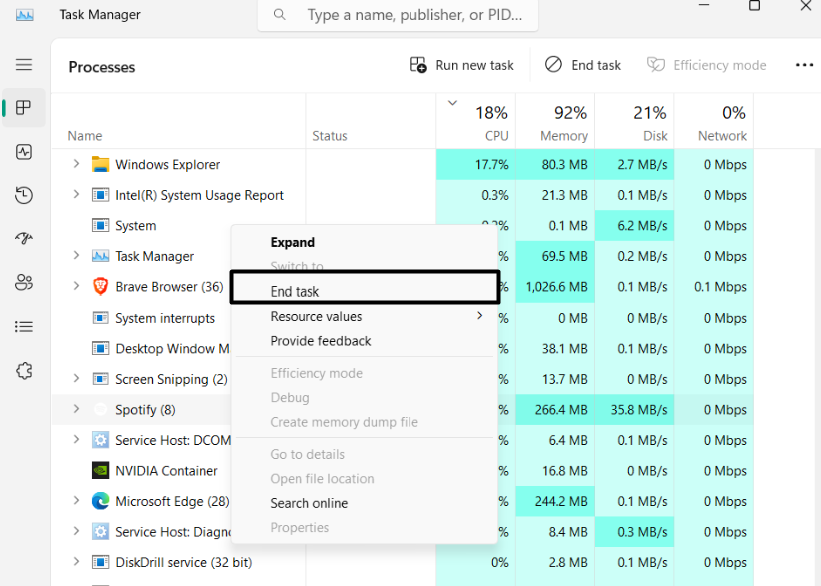 6.Haga clic derecho en un servicio que no sea de Microsoft en elProcesossección y elijaFinalizar tareapara cerrarlo.