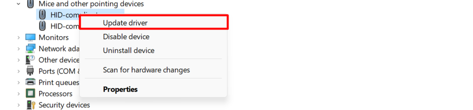 4. Seleccione un conductoren elMenú desplegable de ratones y otros dispositivos señaladoresyhaga clic derechoen ello.