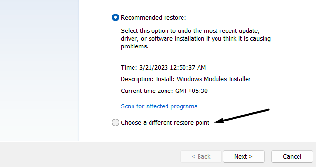 2.Hacer clic enRestaurar sistema…en elRestaurar sistemasección y seleccione laElija una radio de punto de restauración diferentebotón.