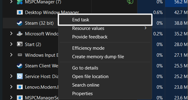 3.Haga clic derecho sobreCortanay seleccione elFinalizar tareaopción del menú para detenerlo.
