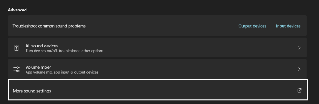 2.Haga clic en elMás configuraciones de sonidoopción en elAvanzadosección para abrir elSonidoinmediato.