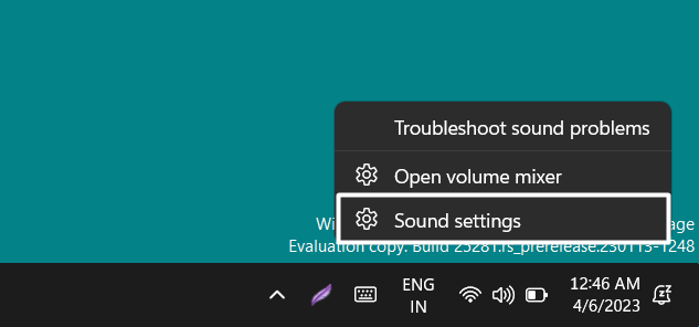 1.Haga clic derecho en el icono del altavoz en la barra de tareas de su sistema y seleccioneConfiguraciones de sonidodesde la ventana emergente.