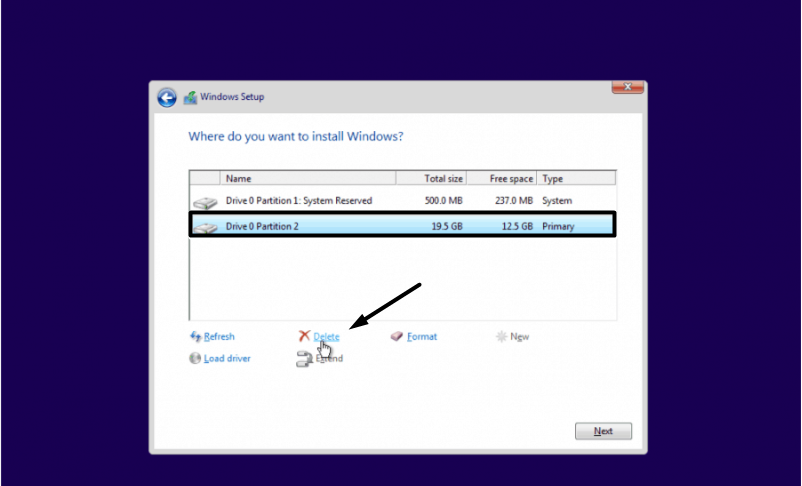 3.en el¿Dónde quieres instalar Windows?ventana, elija la partición del sistema y haga clic enBorrar. Ahora debe aplicar los mismos pasos a otros sistemas y particiones primarias.