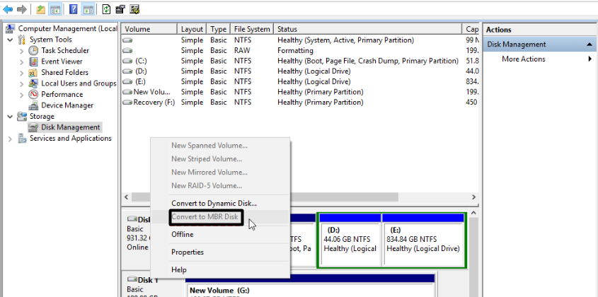 A continuación se detallan los pasos para convertir su disco GPT en un disco MBR usando la utilidad Administración de discos: