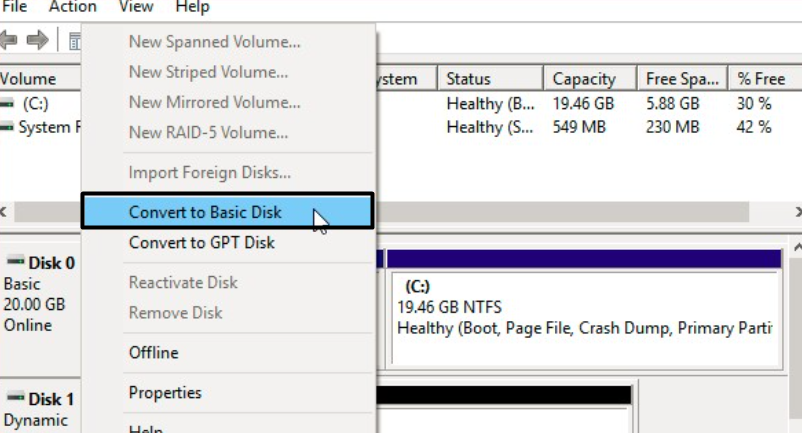 4.Una vez eliminados todos los volúmenes, haga clic derecho en el disco y seleccioneConvertir a disco básicode ello.