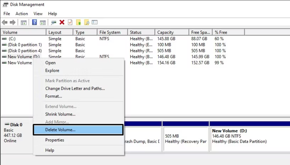 4.Para convertir su disco GPT en un disco MBR, debe eliminar todos los volúmenes existentes. Entonces, para hacerlo, haga clic derecho en un volumen y seleccione elEliminar volumen…opción del menú contextual.