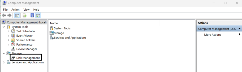 3.Haga clic en elGestión de discosopción bajoAlmacenamientoen el panel de navegación izquierdo para abrirlo.