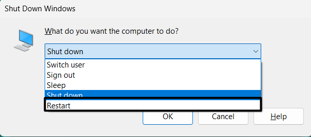 4.Utilice elAlt + F4método abreviado de teclado para abrir elApagar Windowspreguntar y seleccionarReanudarde ello.