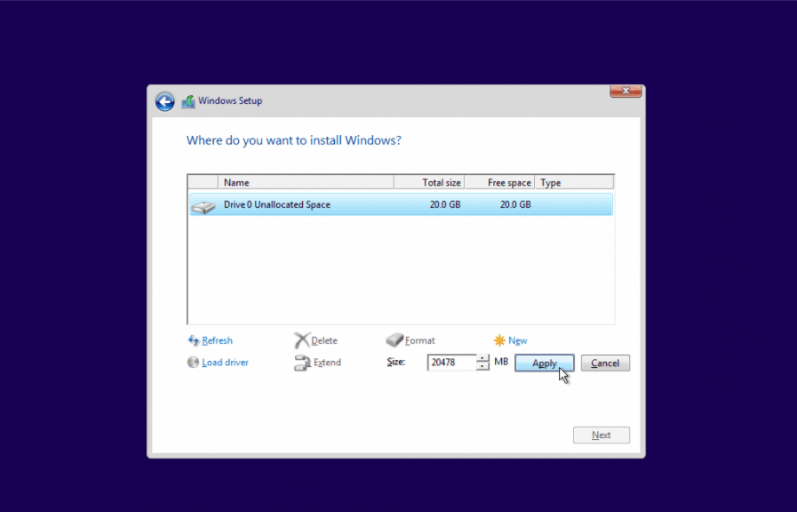 4.Una vez eliminadas todas las particiones, haga clic en elNuevoen la parte inferior y luego haga clic en elAplicarbotón.