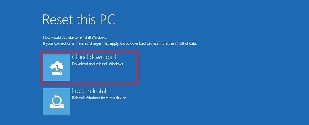 3.Seleccione elDescarga en la nubeopción en el¿Cómo le gustaría reinstalar Windows?inmediato.