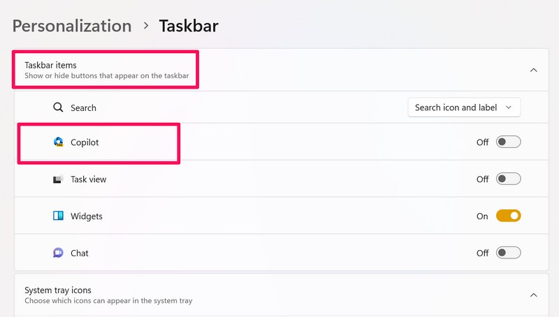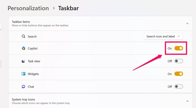 3.En la página siguiente, asegúrese de que el interruptor paraCopilotoopción bajo elElementos de la barra de tareasla sección esactivadoen tu PC o portátil.