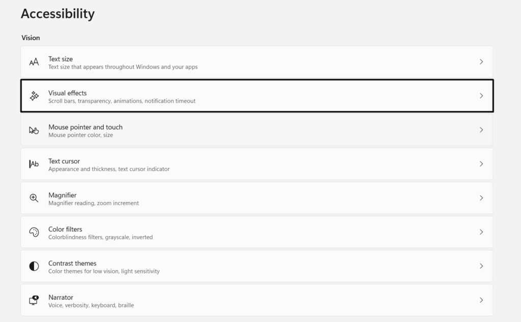 2.En elAccesibilidadventana, debajoVisión, seleccionarEfectos visualespara acceder a la configuración visual.