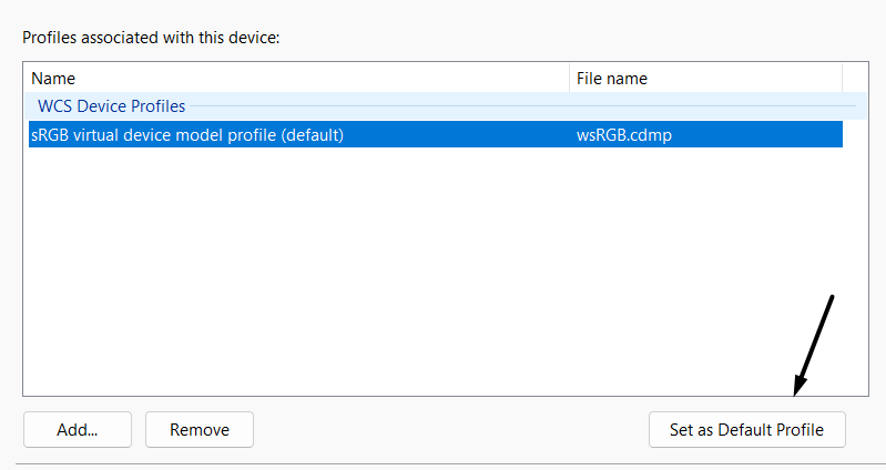6.En elPerfiles de dispositivos WCSsección, seleccione laPerfil de modelo de dispositivo virtual sRGBopción.