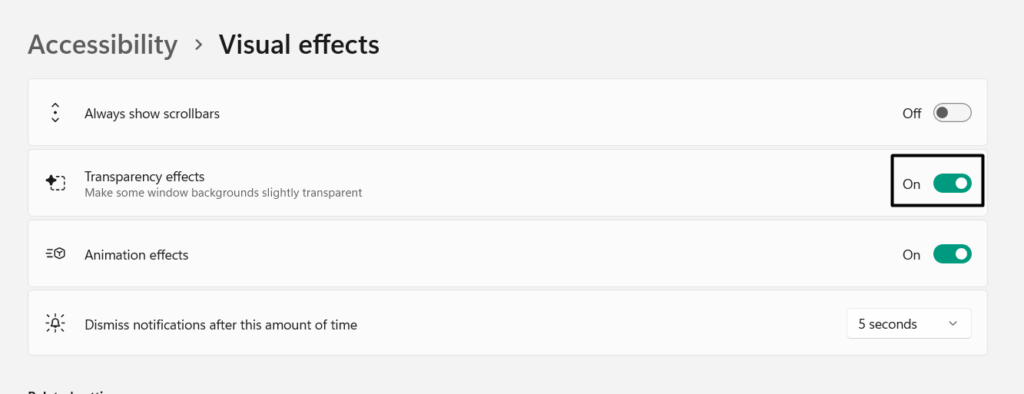 Algunos usuarios dijeron quedesactivar los efectos de transparencia opciónen sus PC les solucionó el problema. Esta característica hace que el fondo de las pestañas sea transparente para que la interfaz de usuario se vea mejor. Y, en ese proceso, a veces causa problemas como estos. Entoncesdesactivarloen su PC con Windows 11 y vea si funciona. Puede desactivarlo siguiendo los pasos que se indican a continuación: