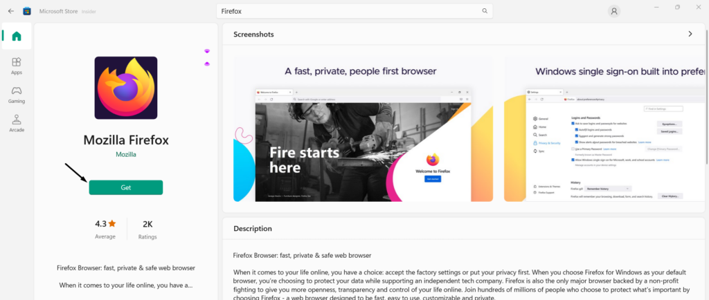 Nota:Si no encuentra el navegador en Microsoft Store, descárguelo de su sitio oficial.