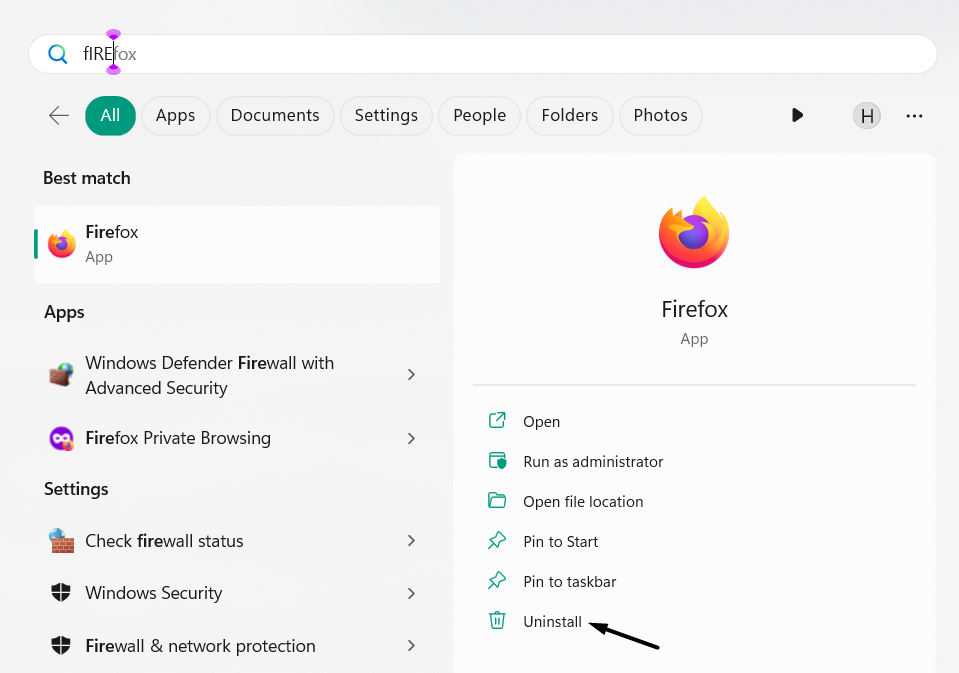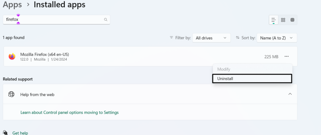 1.Para reinstalar el navegador en su PC, ingrese el nombre del navegador en la búsqueda y haga clic enDesinstalar.