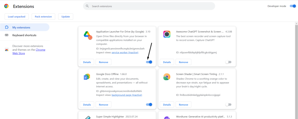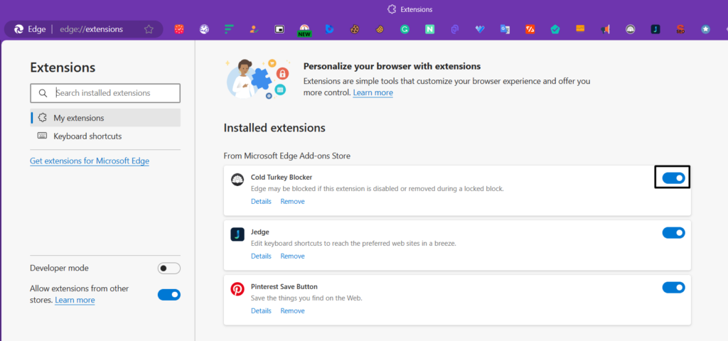 3.bajo elTodas las extensionessección, apague elpalancajunto a la extensión que deseas deshabilitar.
