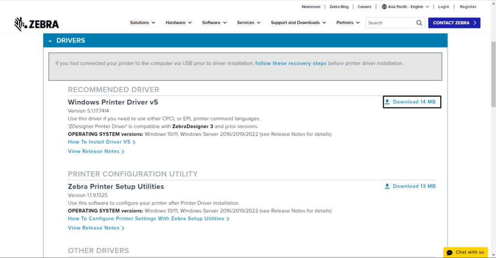4.SeleccionarSoporte de impresora, busque su máquina Zebra y luego descargue la utilidad correspondiente.