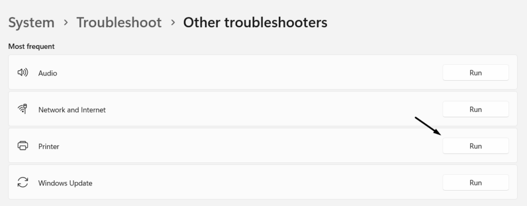 2.En elOtros solucionadores de problemasventana, buscarImpresoraen elMás frecuentesección.