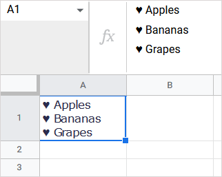La siguiente opción también funciona si desea una lista con viñetas en una celda pero prefiere algo que no sea el punto negro predeterminado, como un emoji o una marca de verificación. También puedes utilizar este método para agregar viñetas a celdas individuales si lo deseas. Simplemente copiarás y pegarás el símbolo desde otra aplicación.