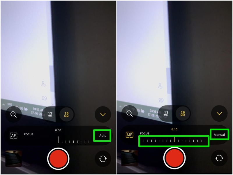 Sin embargo, si desea controlar manualmente el enfoque de sus tomas de video mientras usa la aplicación Final Cut Camera en su dispositivo, puede tocar elOpción automáticaa la derecha para cambiarlo alModo manualosimplemente use el control deslizante para cambiar automáticamente al enfoque manual.