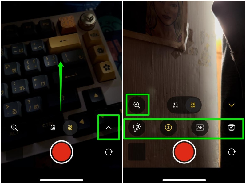 Al lado del conmutador de lentes, encontrará elBotón de control de zoomy unbotón de flecha hacia arribaen el lado izquierdo y derecho, respectivamente. Al tocar el botón de flecha hacia arriba o simplemente deslizar el dedo hacia arriba en la vista previa del video, aparecen botones de control profesional adicionales. Hemos analizado cada uno de ellos en las secciones dedicadas en la última parte de este artículo.