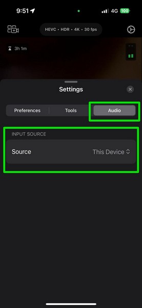 Por último, bajo elSección de audio, puedecambiar entre las fuentes de audio mientras graba videosusando la aplicación Final Cut Camera en tu iPhone. Esto puede resultar útil si utiliza varios dispositivos de grabación de audio en su producción de vídeo y cambia con frecuencia entre ellos.
