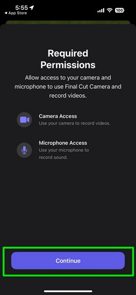 3.A continuación, se le pedirá quehabilitar el acceso a la cámara y al micrófonopara la aplicación Final Cut Camera. Toca elContinuarbotón.