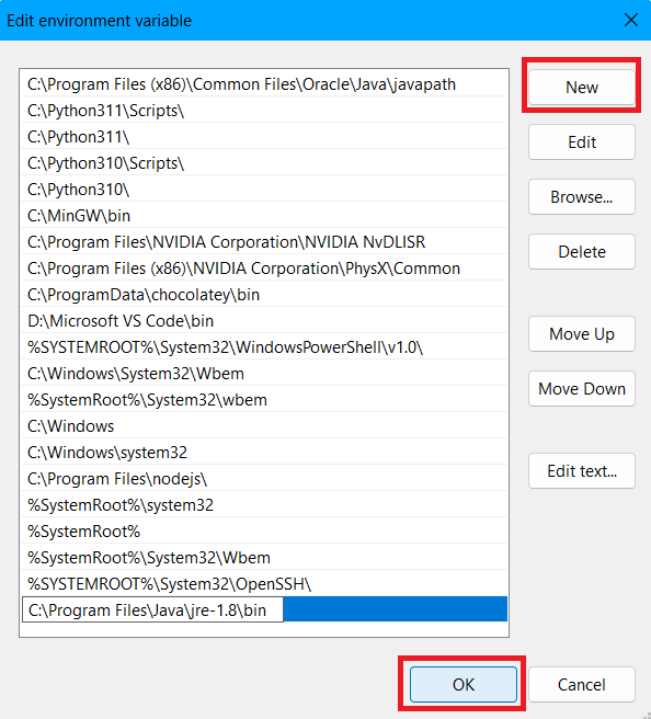 7.Hacer clic enNuevo, pegue la ubicación de la carpeta Bin y presione el botónDE ACUERDObotón.
