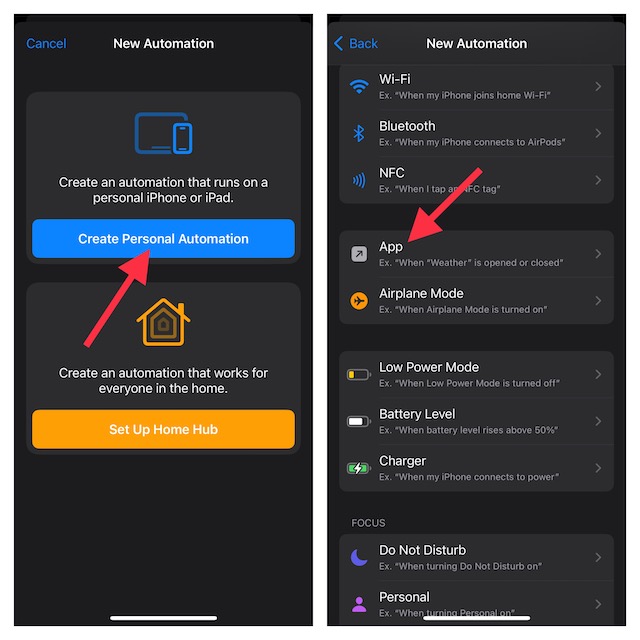- A continuación, toque el botón "+" en la parte superior derecha y seleccioneCrear automatización personalbotón. Si es la primera vez que creas una automatización, simplemente tocaCrear automatización personal.
