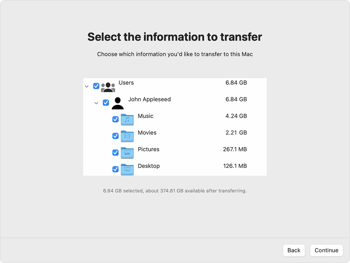 - En Mac, seleccione la información que desea transferir desde la PC y haga clic en Continuar para iniciar la migración de datos.