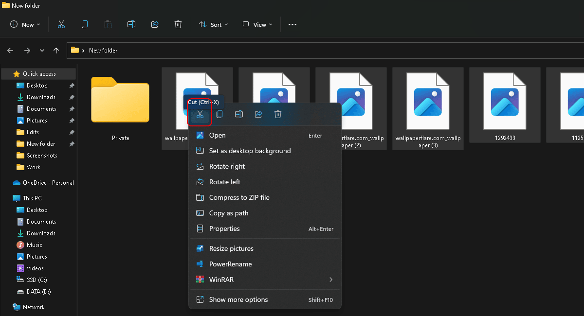 - Abra un archivo privado> seleccione todos los archivos> presione la tecla Ctrl + X en el teclado para cortar/mover los archivos.