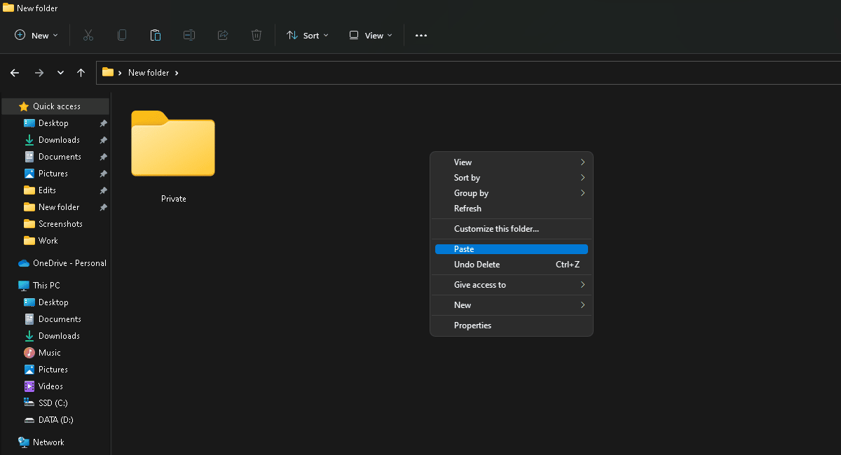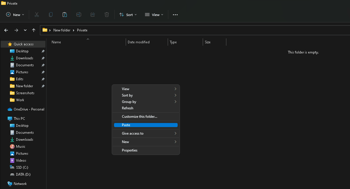 - Abra la carpeta privada> haga clic derecho> pegue los archivos.