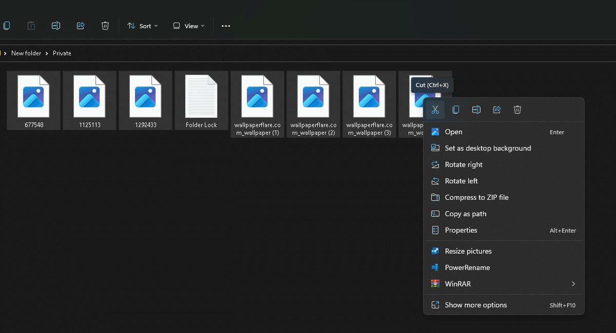 - Ahora puedes agregar los archivos que deseas ocultar o bloquear dentro de la carpeta. Seleccione los archivos> haga clic derecho sobre ellos> haga clic en el icono de la tijera para cortar/mover el archivo.