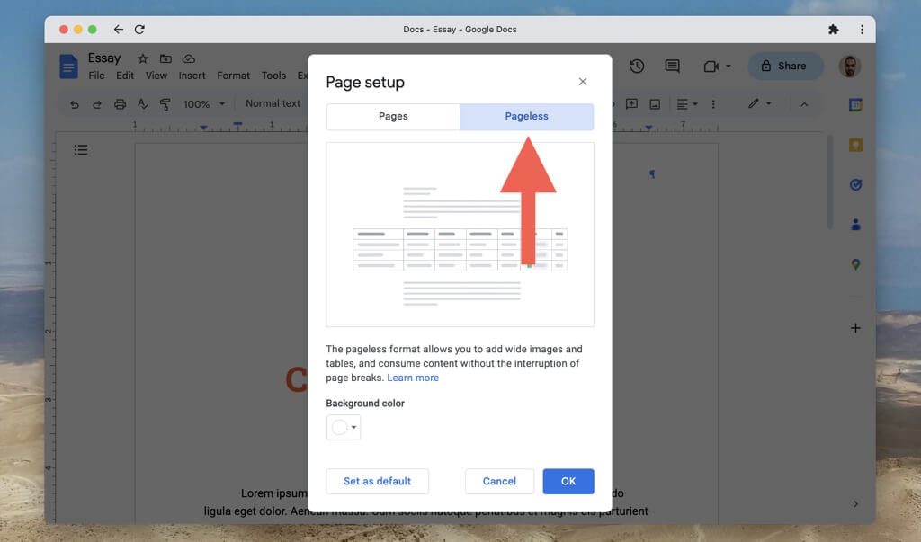 Si desea leer el contenido de un documento de Google Docs sin manualoLos saltos de página automáticos interrumpen el flujo, intente cambiar la configuración de la página al formato Sin páginas. Para hacer eso: