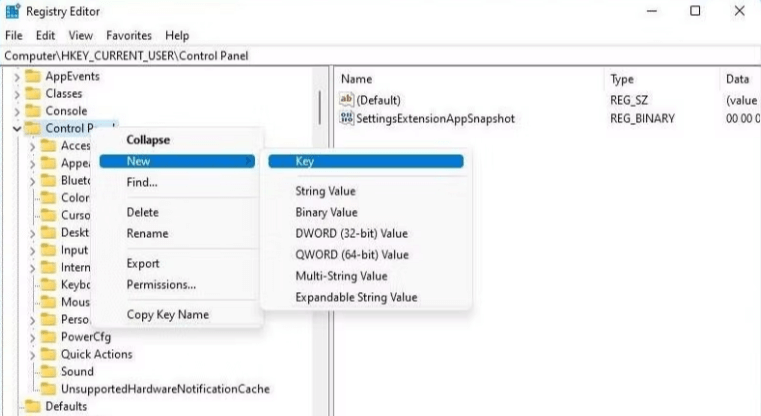 Paso 1:Haga clic con el botón derecho en HKEY_CURRENT_USERPanel de control, la clave Control, en el Editor del Registro y elija Nuevo > Clave.