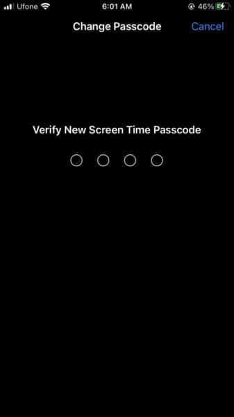 - Ingrese la misma contraseña nuevamente paraVerificar nueva contraseña de tiempo de pantalla.