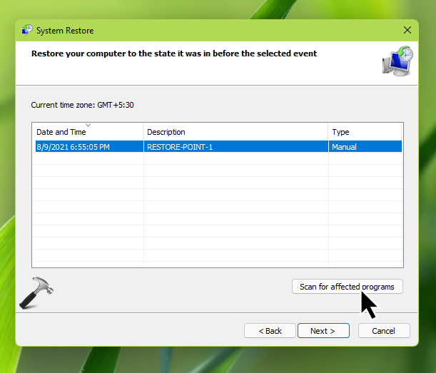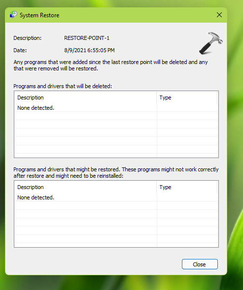 5.Después de revisar los programas afectados, haga clic enCercapara volver a la ventana anterior. Al utilizar el botón Buscar programas afectados, debería poder elegir el mejor punto de restauración que sea beneficioso para usted.